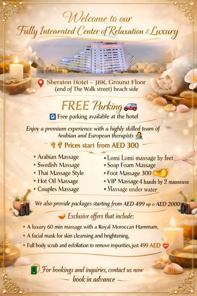 Choose from our branches Ventage Spa Sheraton Hotel JBR Sheraton Hotel, JBR , Dubai Call Whatsapp Eleva Spa Aloft Hotel Palm Jumeirah Aloft Hotel, Palm Jumeirah, Dubai Call Whatsapp Arabian Europain Spa Sheraton JBR Our Packages Expert Team Our Services Arabic Massage Call Whatsapp Read more Massage 4 hands Call Whatsapp read more Couple Massage Call Whatsapp read more Thai Massage Call Whatsapp read more Turkish bath Call Whatsapp read more Lomi Lomi Massage Call Whatsapp read more Hot stone massage Call Whatsapp read more Massage and Oil Bath Call Whatsapp read more Massage and Moroccan bath Call Whatsapp read more Our Location Click here to reach us on google map and see the reviews